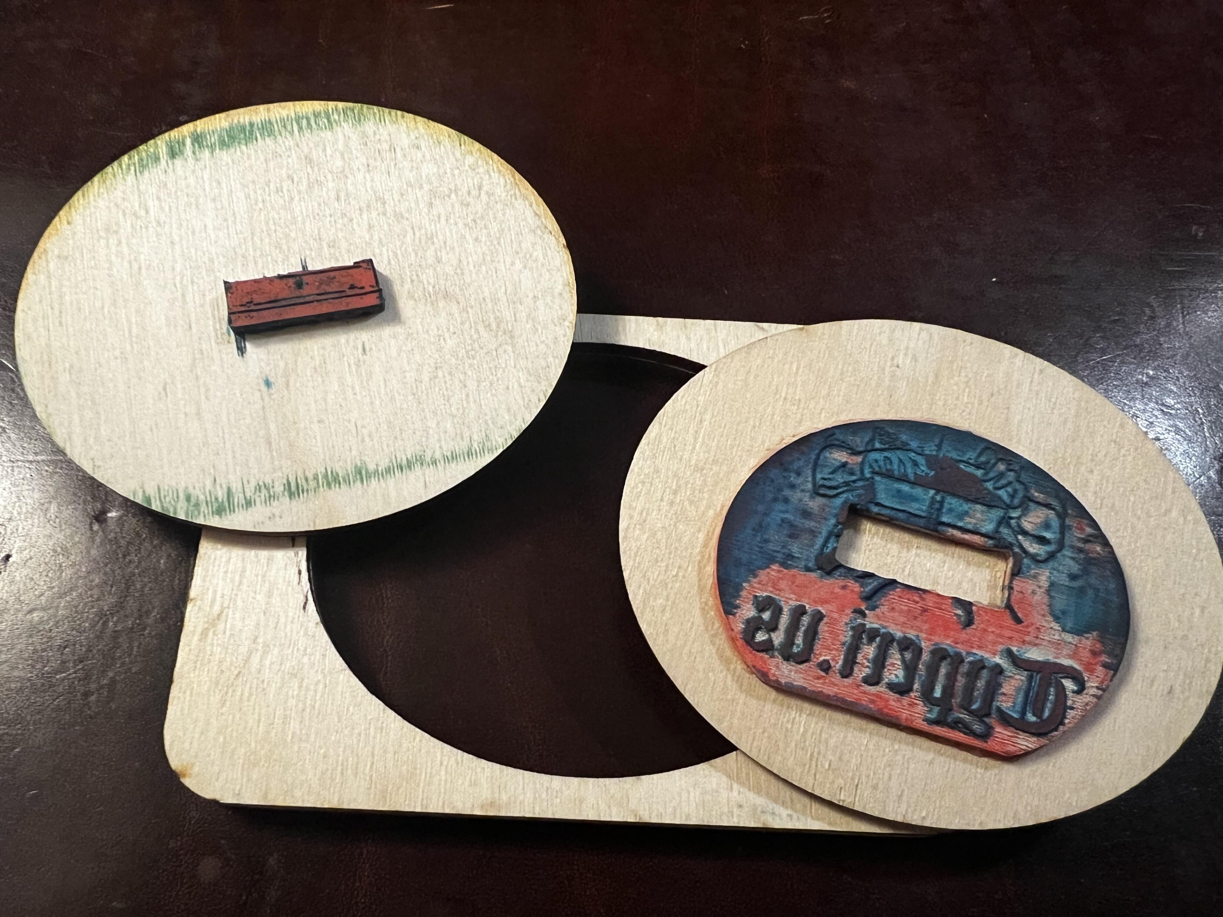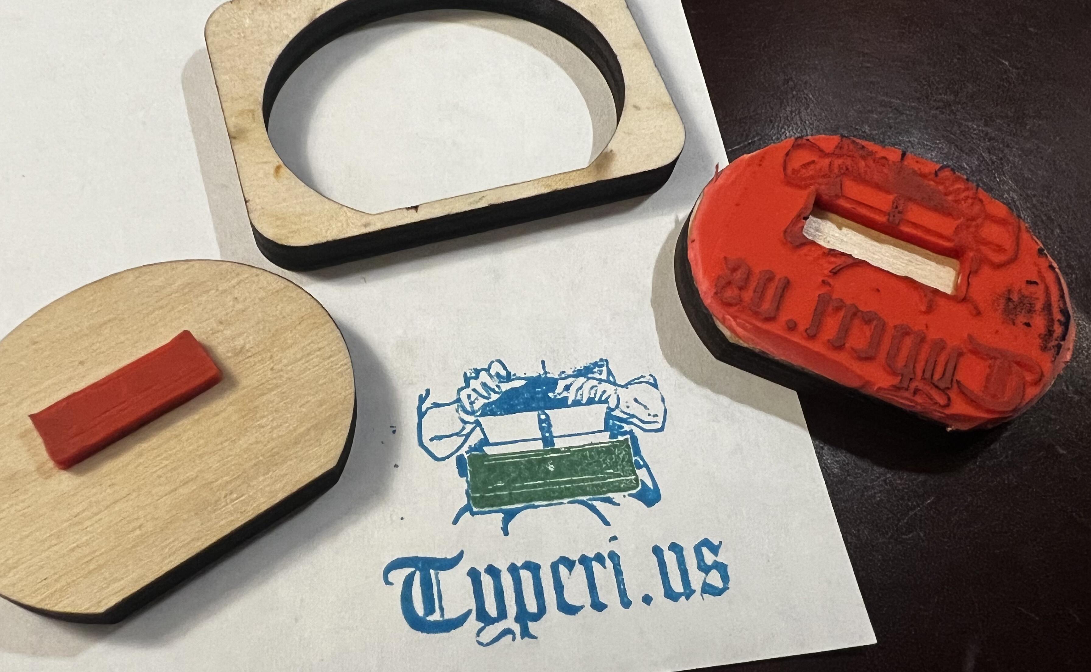 This same method came to mind recently as I had been cutting some stamps at the laser; what would I need to be able to break apart multi-color images into stamps? In the earlier method the shield simply meant that the frame would highlight a different area of the subject stamp. The lack of precision was itself a feature as I could stamp the same subject in the same border multiple times and get unique results. However if I was to break apart a single image and have the different colors align properly, I'd need a way to properly register the different stamps. The shield approach was a bit more artistic, but multiple layers would need to be aligned, hmmm...