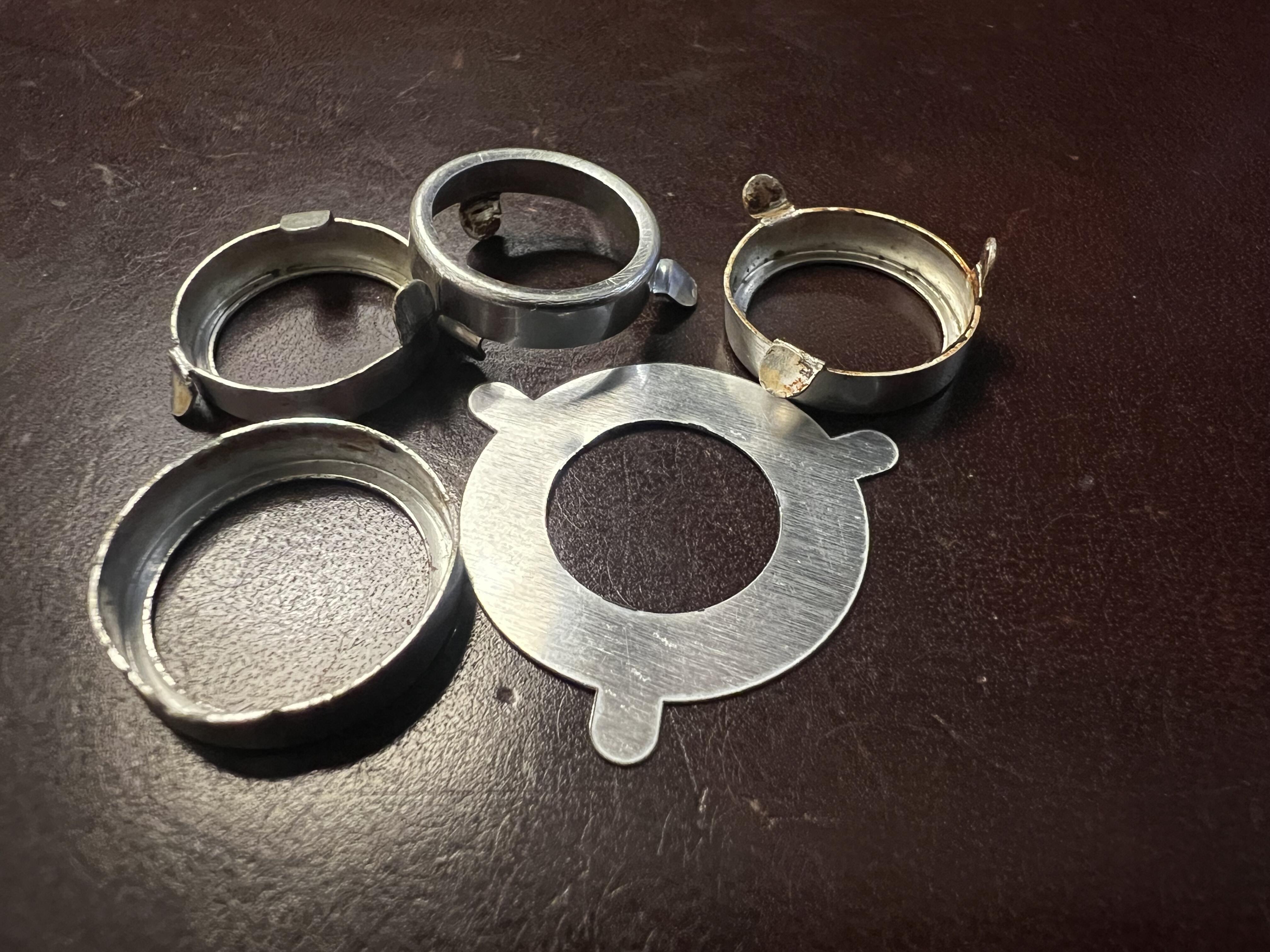 Recently I started setting up a fiber laser, an engraving laser which is capable of doing limited depth engraving in metal, and is capable of full-depth cuts in very small thicknesses. Of note, the factory rings are made from aluminum (a soft metal that can be lasered) and is a mere 0.25mm... So, off I set in the interest of trying to laser-cut a blank that might be formed into a new keyring. This turned out to be relatively straightforward in Lightburn (a laser design software) and I was to generate a rough prototype here.