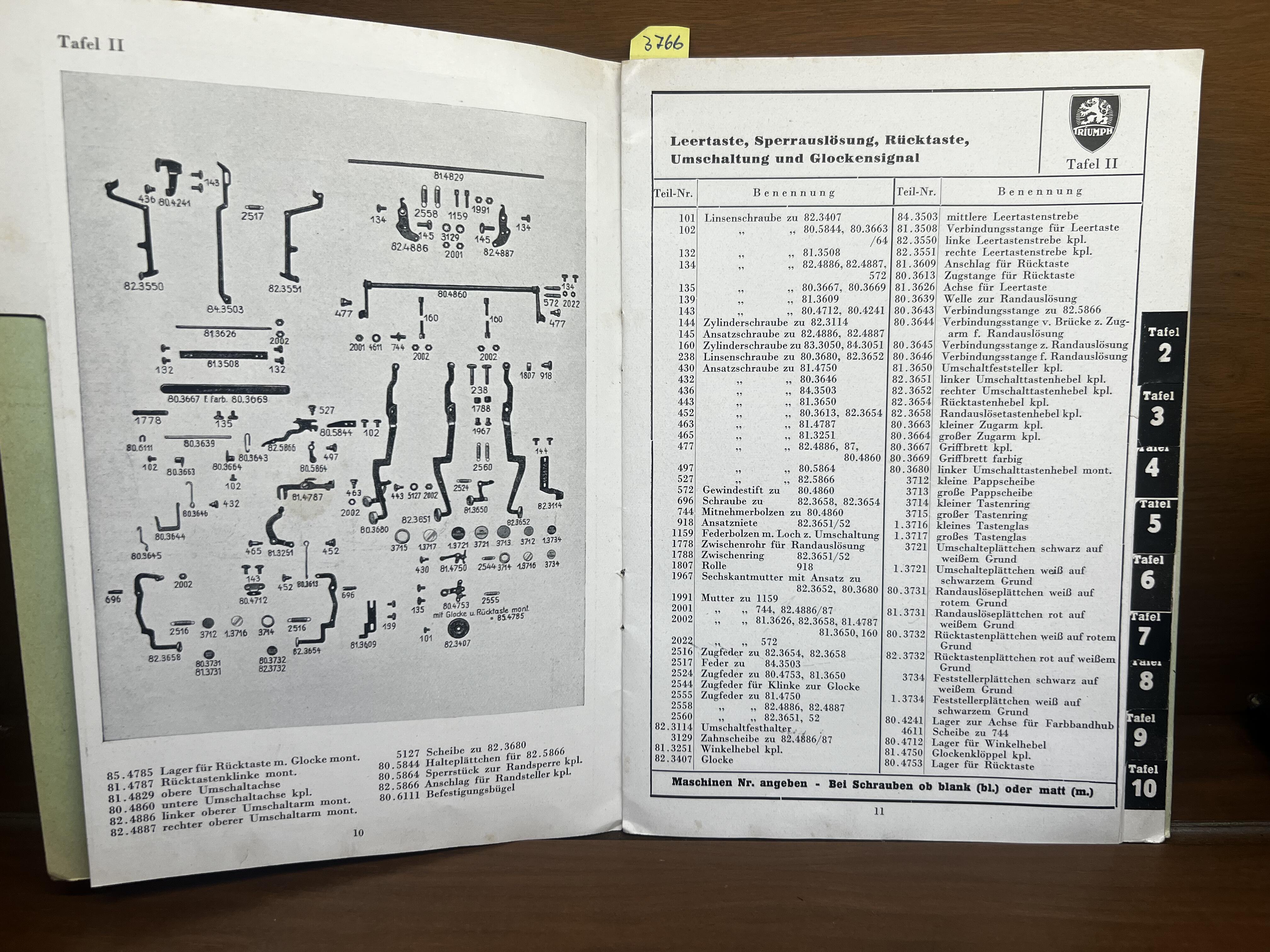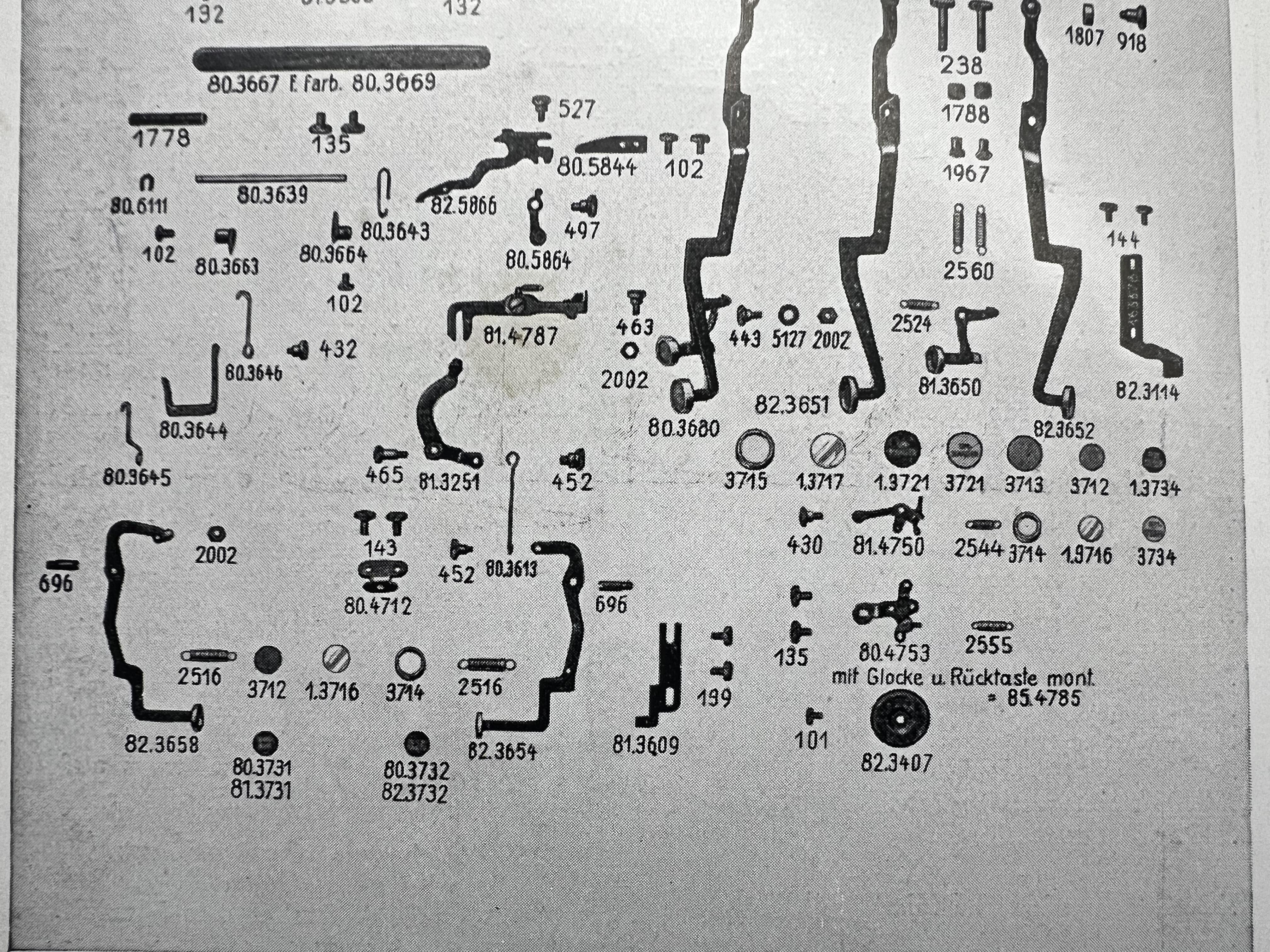 As an example, let's look at one of the price lists for the Norm and Perfekt models from Triumph back in 1935. These would have been contemporaries to the Erika M here that is on the bench. Based on the parts diagrams, it seem the keyrings are part numbers 3714 / 3715 and were a modest 0.04 and 0.05 R.M. each. Given that the Reichsmark seemed to have about a 2.5:1 ratio with the dollar in 1935 and that $0.02 in 1935 is worth about $0.50 today, I think it's safe to say that these would have been reasonable to replace if you happened to break a few while doing some typewriter dental work.